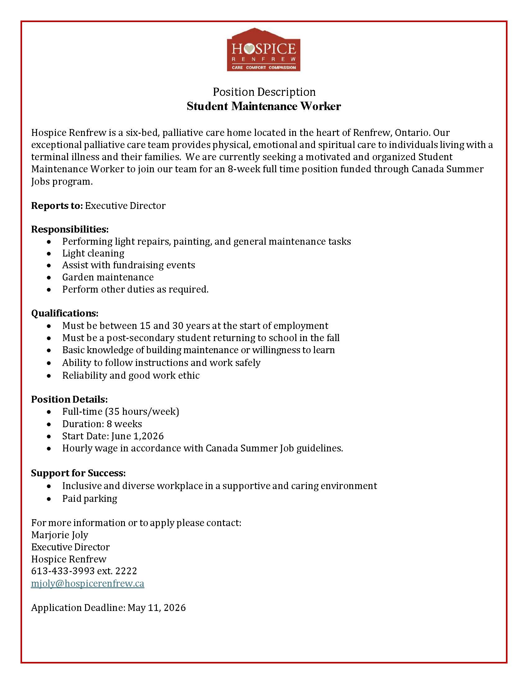 The Maintenance Student assists with the upkeep of Hospice Renfrew’s building and grounds, helping to ensure a safe, clean, and welcoming environment for residents, families, staff, and volunteers. Responsibilities include performing light repairs, painting, and general maintenance tasks; supporting cleaning and event setup; and caring for the gardens and outdoor areas by planting, watering, weeding, mowing, and maintaining pathways. The student follows safety procedures, reports maintenance concerns promptly, and works collaboratively with staff and volunteers to support the overall comfort and appearance of the hospice.